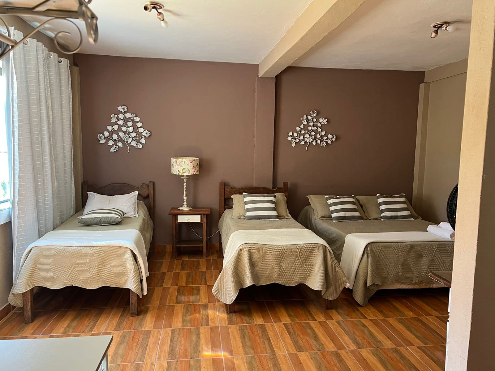 Essas confortáveis suítes possuem : uma cama de casal e duas de solteiro , TV, frigobar, banho com aquecimento, secador de cabelo e ar condicionado quente e frio.